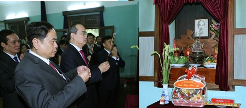 | Nguyên Thiên Nhân (1er plan, 2e à gauche) offre de l'encens, le 15 février, dans la maison 67 du site des vestiges du Président Hô Chi Minh. |