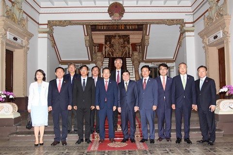 | Le président du Comité populaire de Hô Chi Minh-Ville, Nguyên Thành Phong (centre), et la délégation sud-coréene, le 21 novembre dans la mégapole du Sud. |