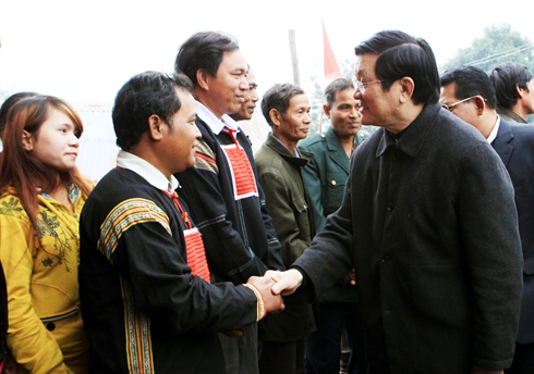 | Le président Truong Tân Sang (droite) visite la commune de Krong Jing, district de M'Drac, province de Dak Lak, le 29 décembre. |