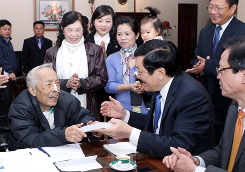 | Le président du Vietnam, Truong Tân Sang (2e à droite), a rendu visite le 22 janvier entre autres, au vieil écrivain Hoc Phi. |