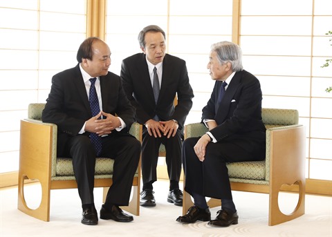 | Le Premier ministre vietnamien Nguyên Xuân Phuc (gauche) et l'Empereur du Japon Akihito, le 6 juin 2017 à Hanoï. |