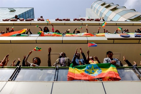 | Des habitants de la capitale éthiopienne Addis Abeba sortent sur leurs balcons pour accueillir le convoi du président érythréen Issaias Afeworki, le 14 juillet. |