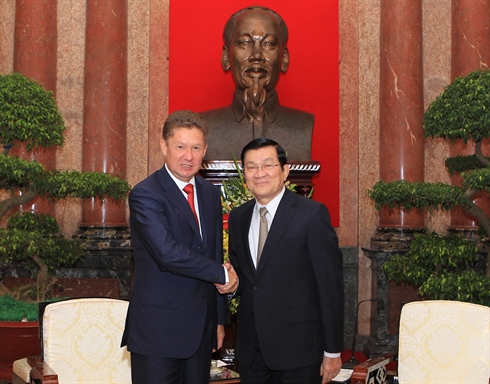 | Le président de la République, Truong Tân Sang (droite), et le président exécutif du groupe russe Gazprom, Alexei Miller, le 4 octobre à Hanoi. |