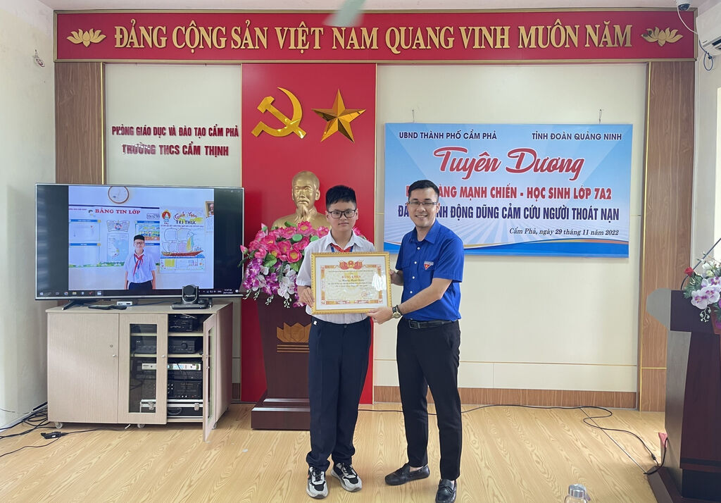 | Hoàng Manh Chiên, élève de la classe 7A2 du collègue Câm Thinh, province septentrionale de Quang Ninh, a été honoré pour son acte de bravoure, le 29 novembre. |