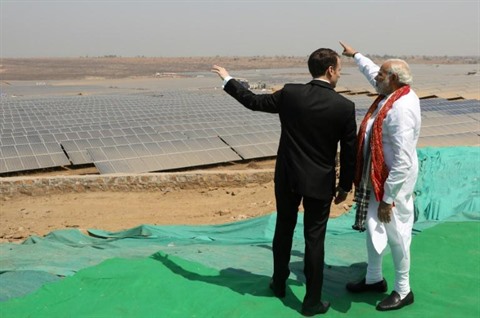 | Le Premier ministre indien (droite) et le président français ont inauguré une centrale solaire dans l'État indien de l'Uttar Pradesh le 12 mars. |