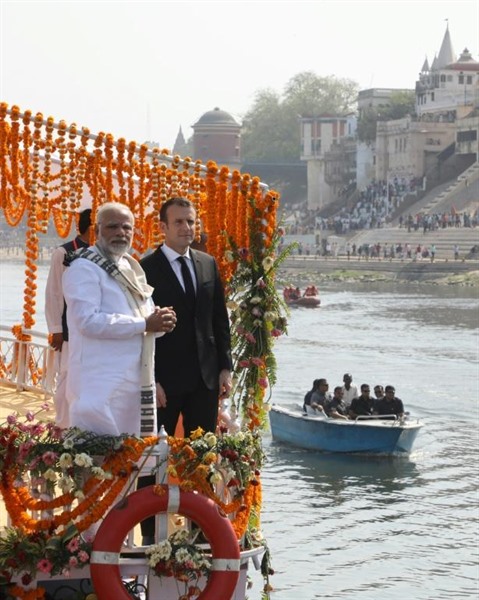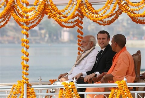 | Le président français Emmanuel Macron (centre) et le Premier ministre Narendra Modi (gauche) ont descendu le Gange le 12 mars. |