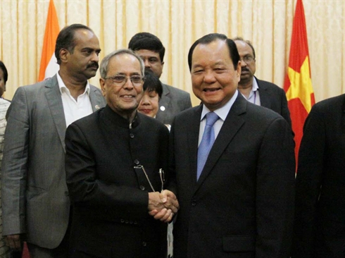 | Le secrétaire du Comité du Parti de Hô Chi Minh-Ville, Lê Thanh Hai (1er plan, à droite) serre la main au président indien Pranab Mukherjee, le 16 septembre à Hô Chi Minh-Ville. |