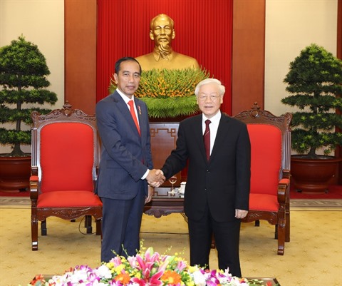 | Le secrétaire général du PC vietnamien Nguyên Phu Trong (droite) et le président indonésien Joko Widodo, le 12 septembre à Hanoï. |