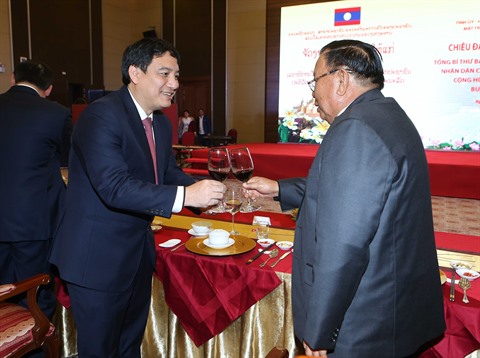 | Le secrétaire général et président lao Bounnhang Vorachith (droite) et le membre du Comité central du Parti communiste du Vietnam (PCV) et secrétaire du Comité du PCV de la province de Nghê An, Nguyên Dac Vinh, le 20 décembre à à Nghê An. |