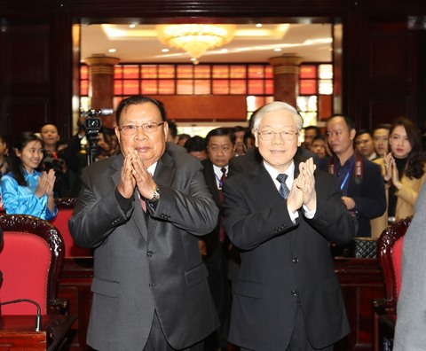 | Le secrétaire général et président lao Bounnhang Vorachith (gauche) et le secrétaire général Nguyên Phu Trong, le 20 décembre à Hanoï. |