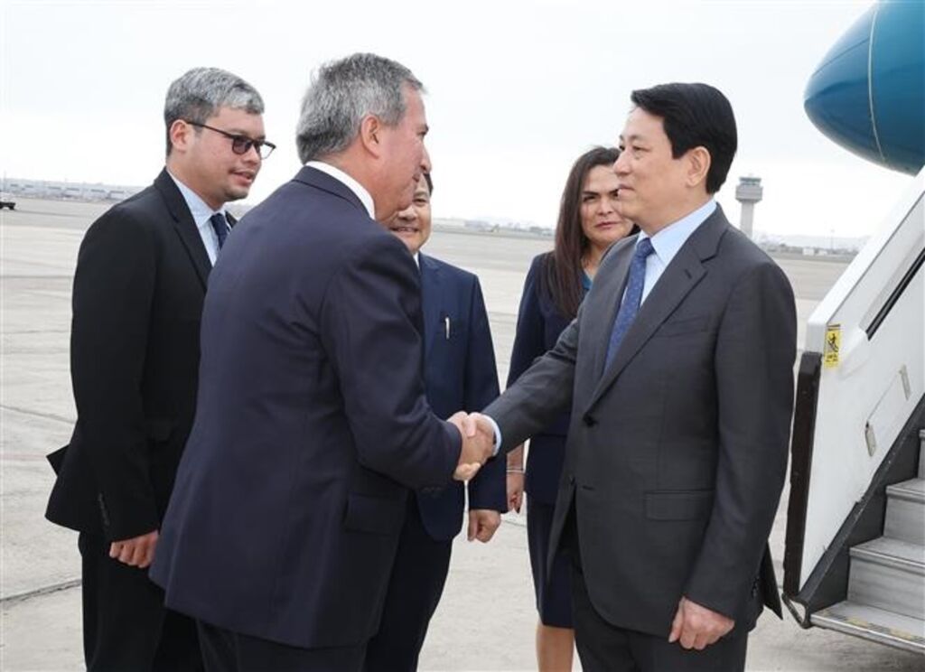 | Le président Luong Cuong (centre) à sa descente d’avion à l’aéroport international Jorge Chavez de Lima, au Pérou, le 12 novembre. |