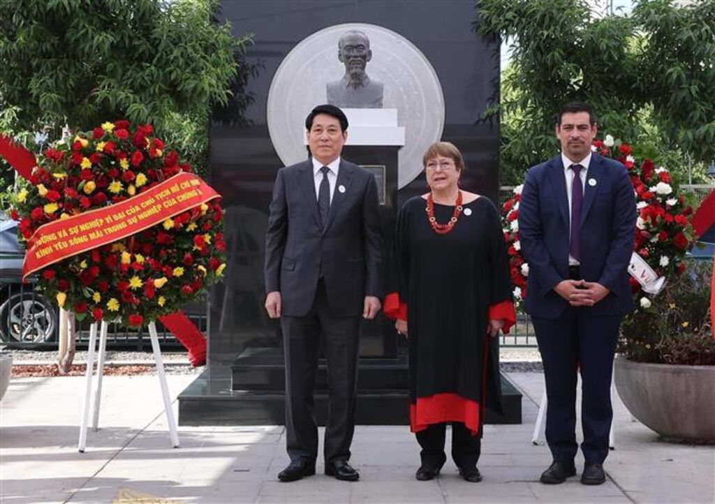 | Le président Luong Cuong (gauche), l'ancienne présidente chilienne Michell Bachelet et le maire de la commune de Cerro Navia, Mauro Tamayo, lors de la cérémonie de dépôt de fleurs au Monument du Président Hô Chi Minh dans le parc portant son nom dans la capitale Santiago. |