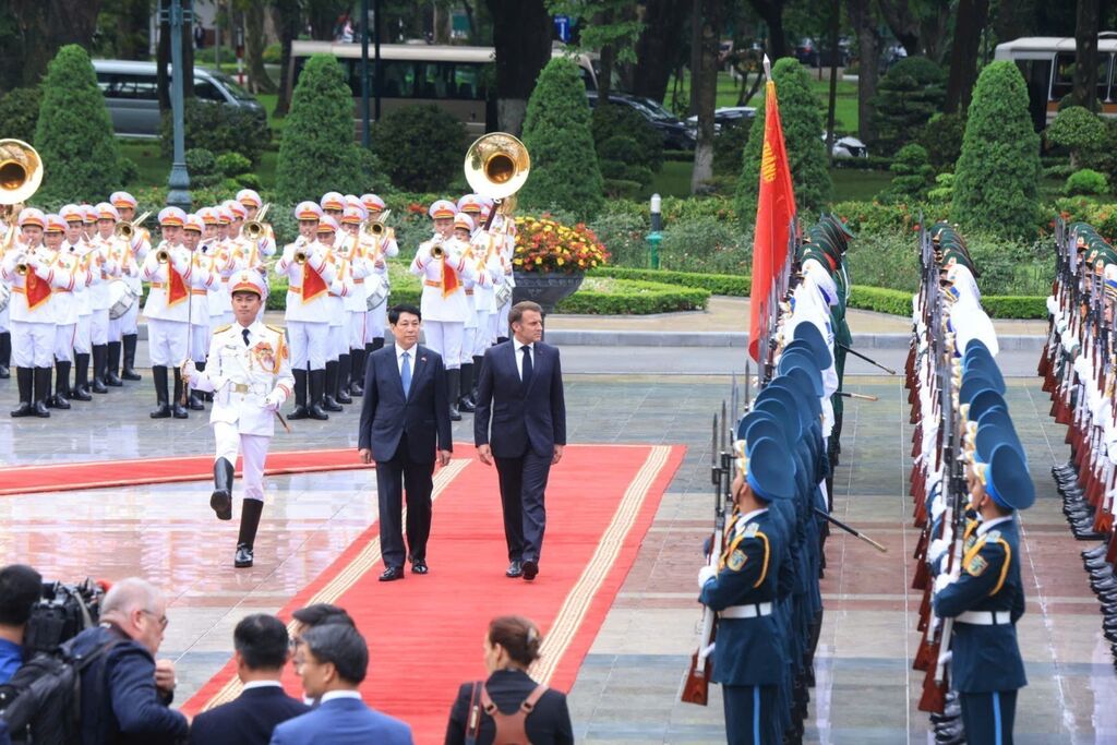 | Le président Luong Cuong préside la cérémonie d'accueil officielle de son homologue français Emmanuel Macron. |