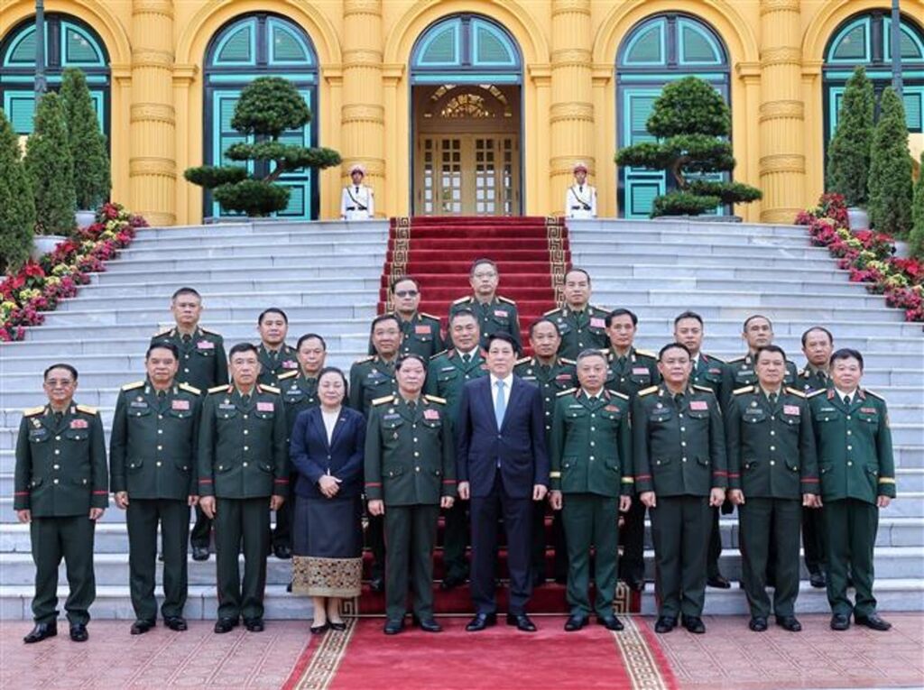 | Le président Luong Cuong et la délégation du Département général de la politique de l'Armée populaire lao. |