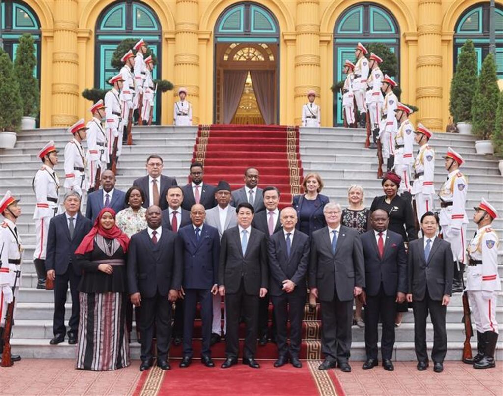 | Le président Luong Cuong (centre) pose avec des ambassadeurs. |
