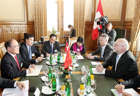| Rencontre entre le président de l'Assemblée nationale vietnamienne, Nguyên Sinh Hùng (gauche), et le président du Conseil national de Suisse, Ruedi Lustenberger, le 18 mars à Berne. Photo : Nhan Sang/VNA/CVN |
