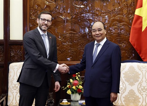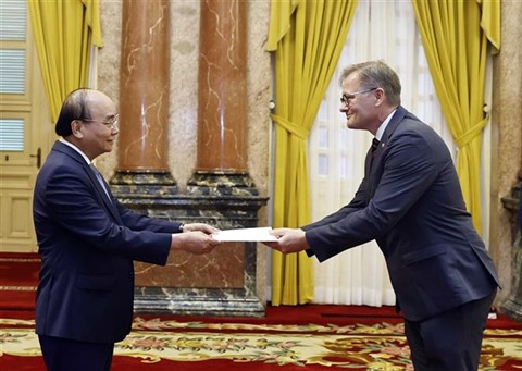 | L'ambassadeur du Danemark, Nicolai Prytz (droite), présente ses lettres de créance au président vietnamien Nguyên Xuân Phuc, le 8 septembre à Hanoï. |