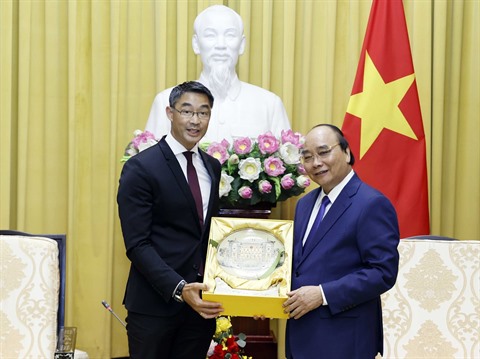 | Le président Nguyên Xuân Phuc (droite) et le consul d’honneur du Vietnam en Suisse, Philipp Rosler, le 28 juin à Hanoï. |