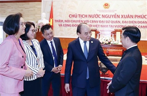 Le président Nguyên Xuân Phuc rencontre la communauté de Vietnamiens au Cambodge.
