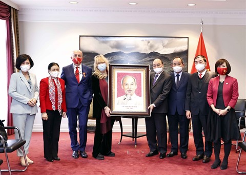 | Le président Nguyên Xuân Phuc offre un portrait du Président Hô Chi Minh à la consule honoraire du Vietnam à Turin (Italie), Sandra Scagliotti. |