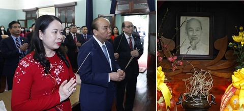 | Le président Nguyên Xuân Phuc (centre) offre de l'encens au Président Hô Chi Minh à la Maison 67 au palais présidentiel à Hanoï, le 31 janvier. |