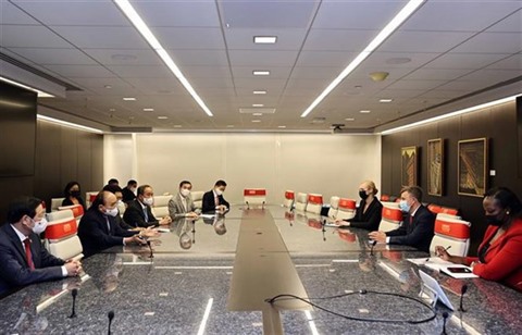 | Le président Nguyên Xuân Phuc rencontre les représentants de Pfizer, l'une des principales sociétés pharmaceutiques et biotechnologiques au monde, implantée à New York. |