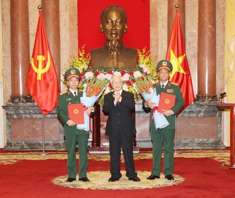 | Le secrétaire général du Parti communiste et président du Vietnam, Nguyên Phu Trong (centre), et deux nouveaux généraux de corps d’armée Trân Quang Phuong et Dô Can. |