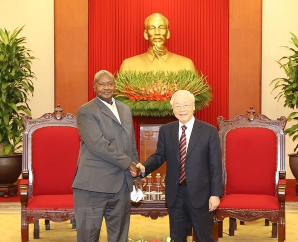 | Le secrétaire général du Parti communiste vietnamien, Nguyên Phu Trong (à droite), et le président ougandais, Yoweri Kaguta Museveni. |