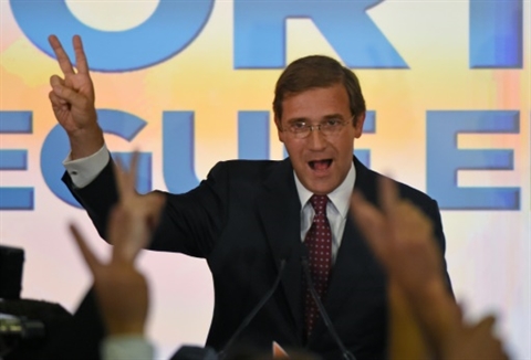| Le Premier ministre portugais Pedro Passos Coelho fête sa victoire aux législatives, le 4 octobre à Lisbonne |