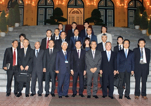 | Le président Truong Tân Sang (premier plan, 5e à droite) et les membres de la délégation de la Chambre de Commerce et d’Industrie du Japon, le 31 octobre à Hanoi. |