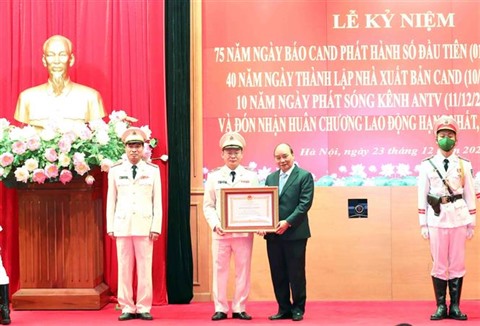 | Le président Nguyên Xuân Phuc remet l'Ordre du travail de 2e classe à la Maison d'édition de la police populaire à Hanoï, le 23 décembre. |