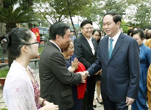 | Le président Trân Dai Quang (droite) rencontre des représentants des compatriotes vietnamiens à l’étranger. |