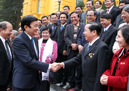 | Le chef de l'État, Truong Tân Sang (2e à gauche), lors d'une rencontre avec des représentants en charge de la diplomatie populaire de l'Union des associations de l'UNESCO du Vietnam, le 20 janvier à Hanoi. |