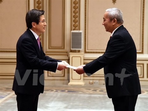 | L'ambassadeur Nguyên Vu Tu (droite) présente ses lettres de créance au président par intérim de la République de Corée, Hwang Kyo-ahn |