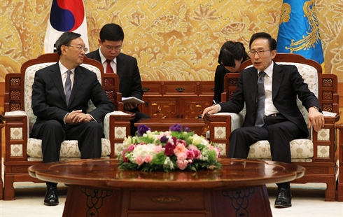 | Le président sud-coréen Lee Myung-bak (droite) et le ministre chinois des Affaires étrangères Yang Jiechi, le 2 mars à Séoul. Photo : YONHAP/VNA/CVN |