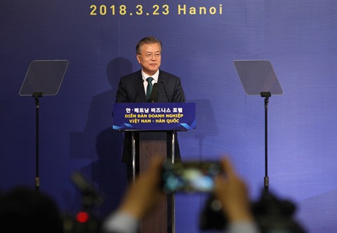 | Le président sud-coréen Moon Jae-in prend la parole lors du Forum d'affaires Vietnam - République de Corée à Hanoï. |