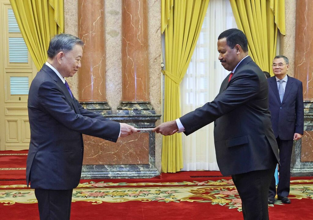 | L'ambassadeur du Timor-Leste, João Pereira, présente ses lettres de créances au président Tô Lam (gauche). |
