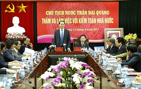 | Le président Trân Dai Quang (debout) a eu une séance de travail le 13 avril à Hanoi avec l’Audit d’État. |