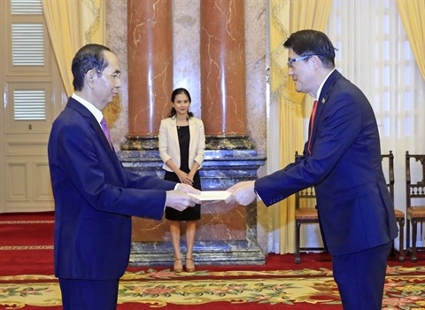 | Le président Trân Dai Quang (gauche) reçoit la lettre de créance de l'ambassadeur |