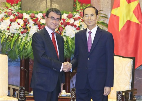| Le président de la République, Trân Dai Quang (droite), et le ministre japonais des Affaires étrangères, Taro Kono. |