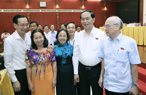 | Le président Trân Dai Quang (2e à droite) encontre des électeurs de Hô Chi Minh-Ville. |