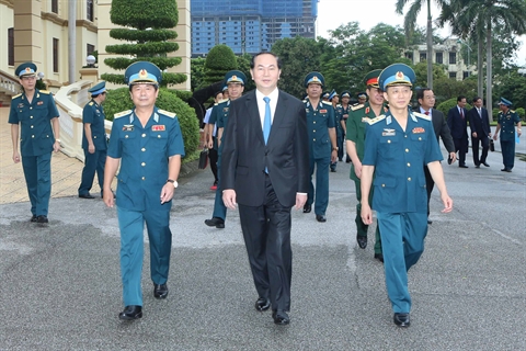 | Le président Trân Dai Quang (centre) rend visite le 19 août à l'Armée de l'air et de défense antiaérienne du ministère de la Défense. |