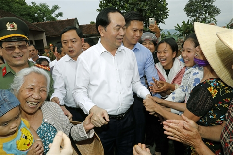 | Le président Trân Dai Quang (centre) rencontre les habitants de la commune de Nghia Dông, district de Tân Ky de la province centrale de Nghê An, le 28 avril. |