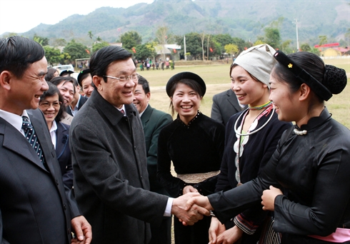 | Le président Truong Tân Sang (centre) rencontre la population de la commune de Kim Binh. |