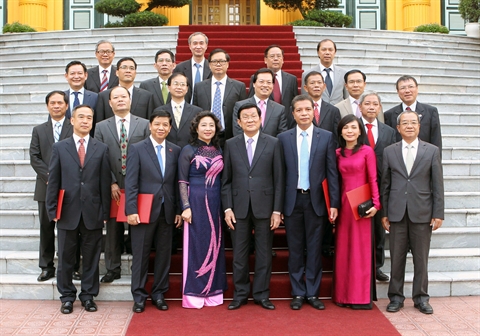 | Le président Truong Tân Sang et de nouveaux ambassadeurs et chefs d'organes de représentation du Vietnam à l'étranger pour le mandat 2015-2018, le 27 mai à Hanoi. |