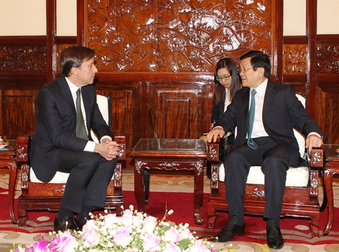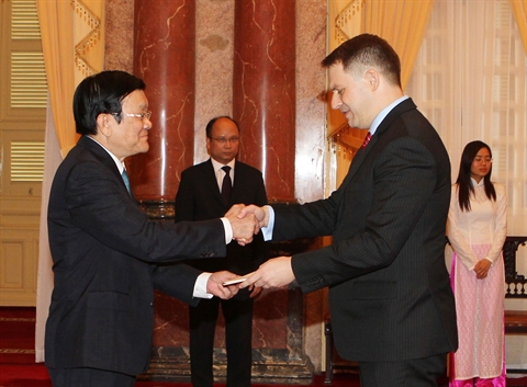 | Le président vietnamien Truong Tân Sang (gauche) a reçu, jeudi 19 mars à Hanoi, le nouveau ambassadeur du Luxembourg, Robert Lauer. |