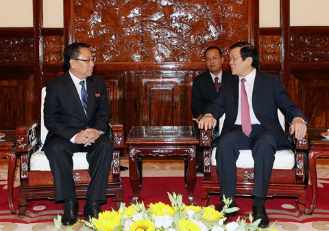 | Le président Truong Tân Sang (droite) a reçu Kim Myong Gil, ambassadeur de la RPD de Corée. |