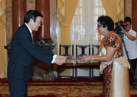 | Le président Truong Tân Sang a reçu Mme Saranya Hasathi Urugodawatte Dissanayake, ambassadeur du Sri Lanka. |