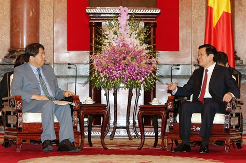 | Le président du Vietnam, Truong Tân Sang (droite), et le ministre japonais Hayashi Yoshimasa, le 11 août à Hanoi. |