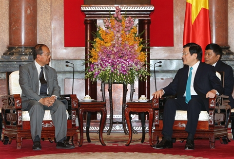 | Le président vietnamien, Truong Tân Sang (droite), et le ministre lao de la Justice, Bounkheut Sangsomsack, le 5 novembre à Hanoi. |